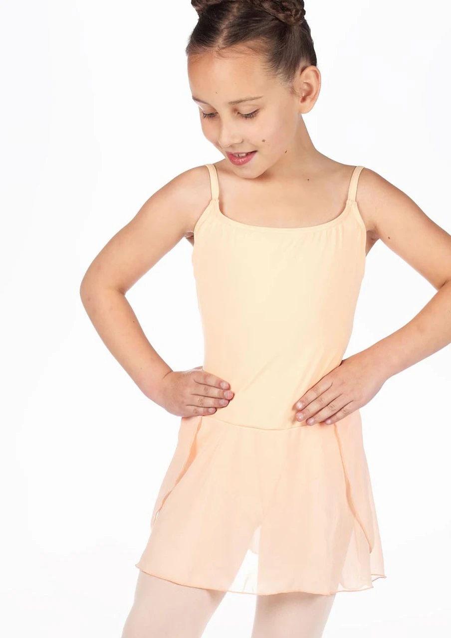 A new children’s leotard dress from Capezio, with a simple camisole leotard and overlapping, layered chiffon skirt attached. The camisole straps are adjustable and the the shelf bra lining features logo elastic.
