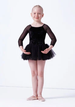 Your little dancer will look so smart in this ballroom dress despite it being relatively simple. Tappers & Pointers offer you a versatile outfit choice with this style because the tank sleeves and plain design mean you can dress this style up for your little dancer’s shows and competitions. The slight shine in the stretchy fabric makes it look fabulous under lights. The skirt of the dress opens up fully and ripples during turns and dips.